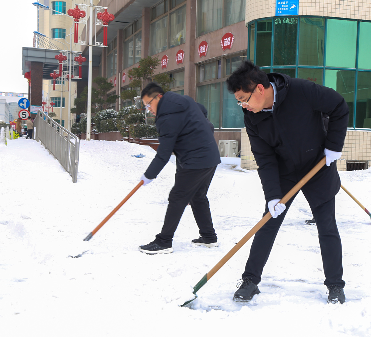 醫(yī)院領(lǐng)導(dǎo)身先士卒,干部職工們干勁十足。大家手持鐵鍬、掃帚等工具,敲冰層、掃積雪,迅速將急診、門診樓、120通道等重點(diǎn)道路上的積雪和暗冰清除干凈,為生命通道掃清了障礙。