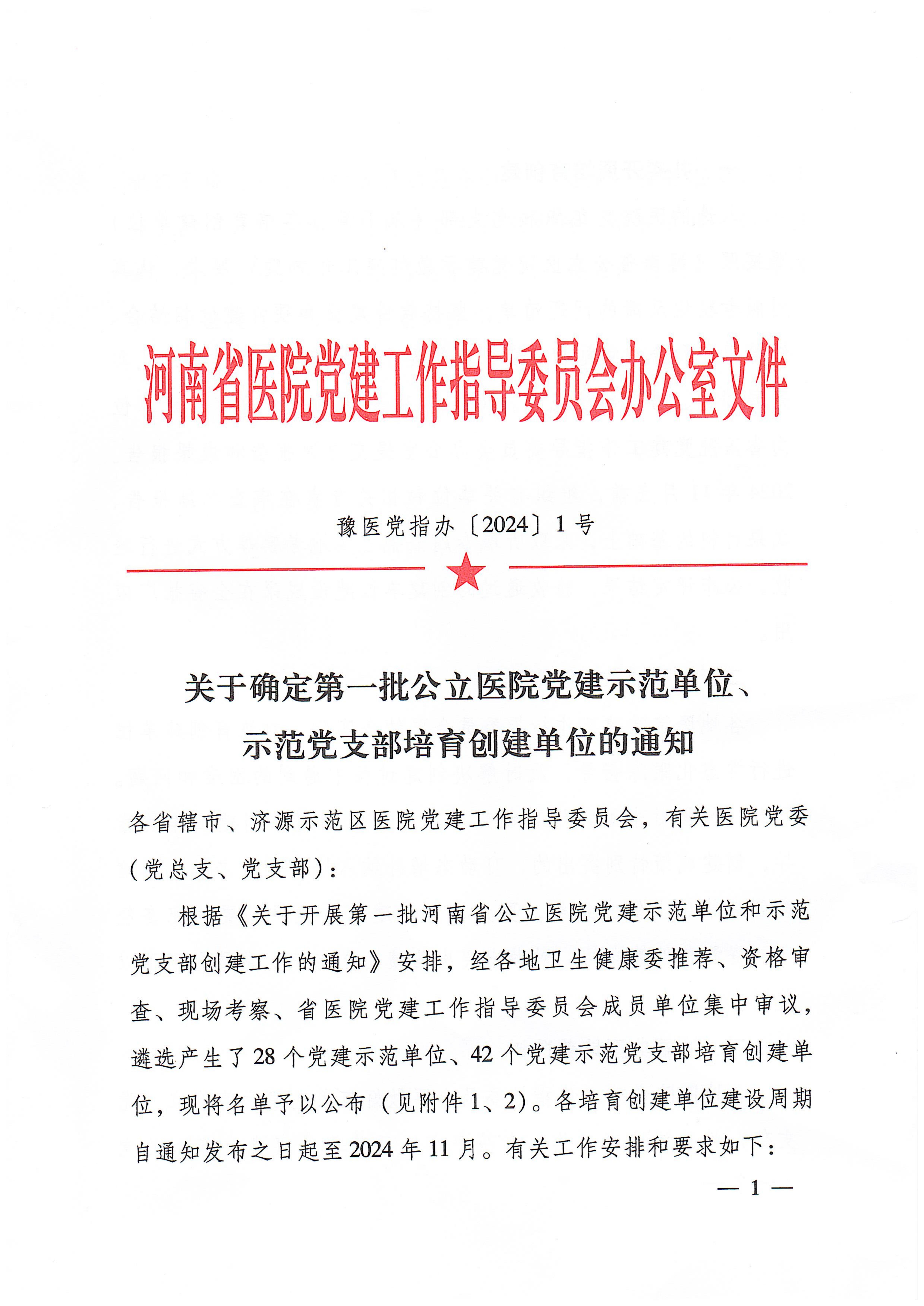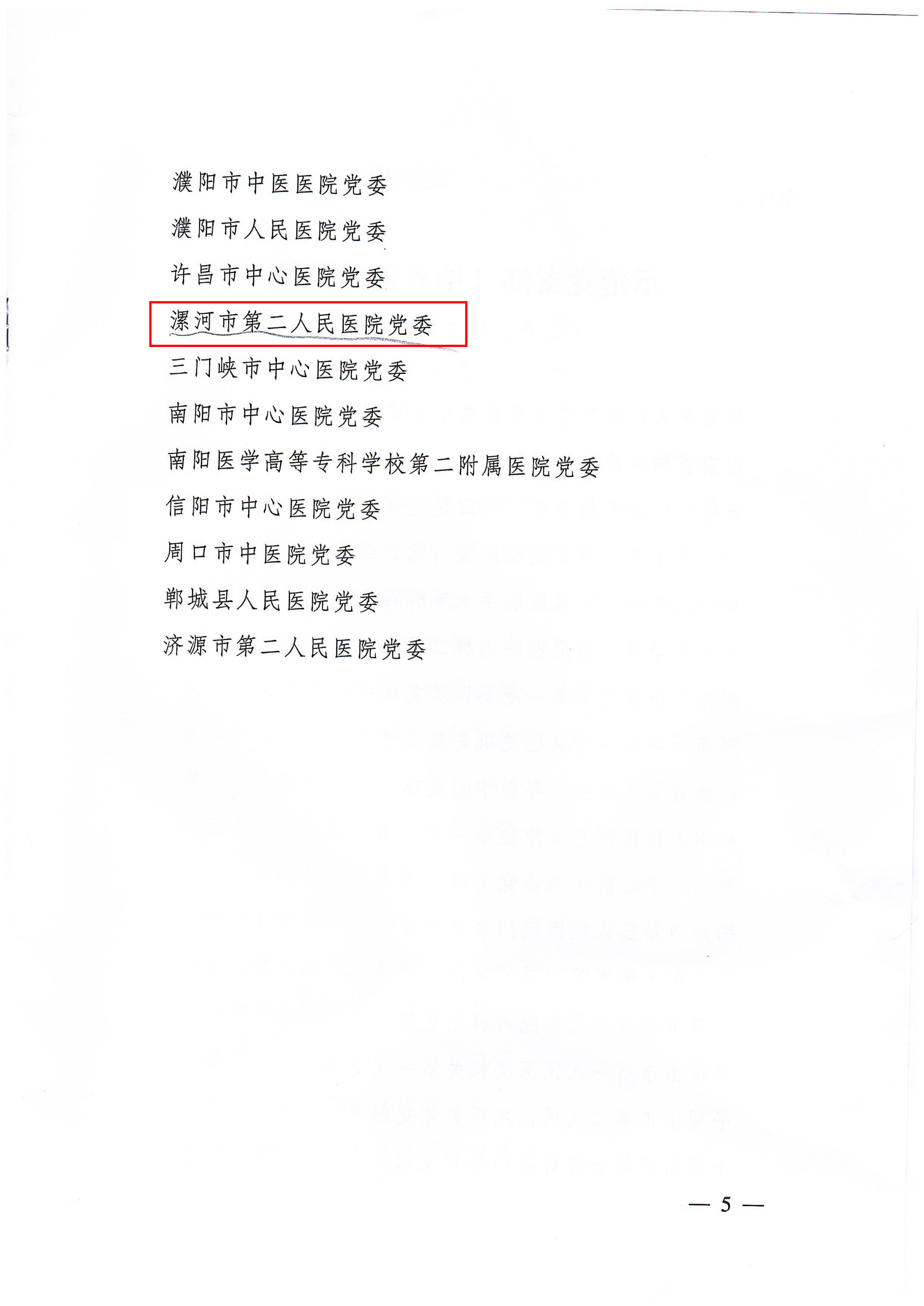 近日,河南省醫(yī)院黨建工作指導(dǎo)委員會(huì)下發(fā)《關(guān)于確定第一批公立醫(yī)院黨建示范單位、示范黨支部培育創(chuàng)建單位的通知》,市二院黨委被確定為河南省公立醫(yī)院黨建示范單位(培育創(chuàng)建單位),是全省28個(gè)黨建示范單位之一、漯河地區(qū)唯一。