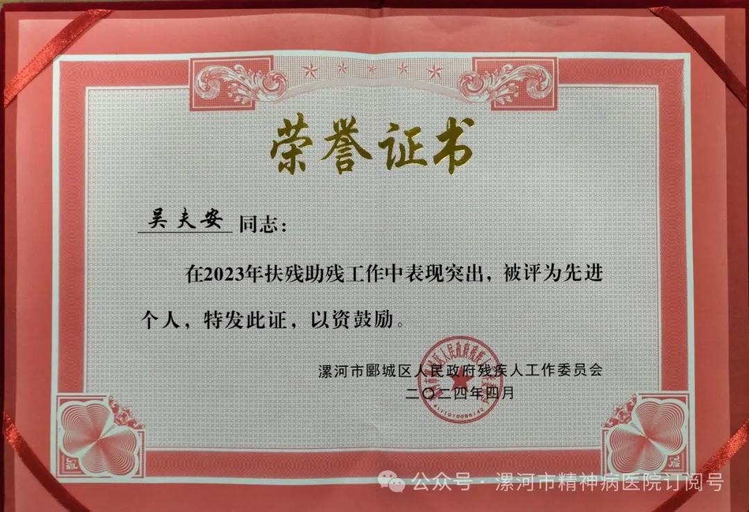 2024年4月24日上午,在漯河市郾城區(qū)殘聯(lián)“關(guān)于表彰2023年度全區(qū)殘疾人工作先進(jìn)集體和先進(jìn)個人”表彰會議中,漯河市精神病醫(yī)院獲得“2023年度扶殘助殘工作先進(jìn)集體”,吳夫安同志在2023年度扶殘助殘工作中表現(xiàn)突出被評為“先進(jìn)個人”榮譽(yù)稱號。