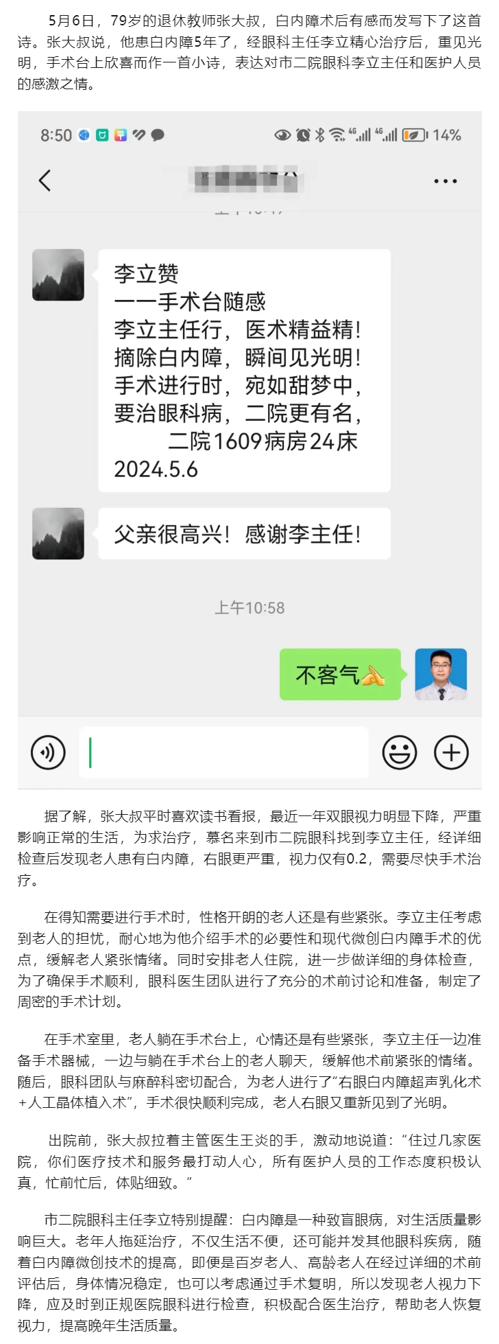 患者賦詩(shī)向市二院眼科醫(yī)護(hù)人員表示感謝