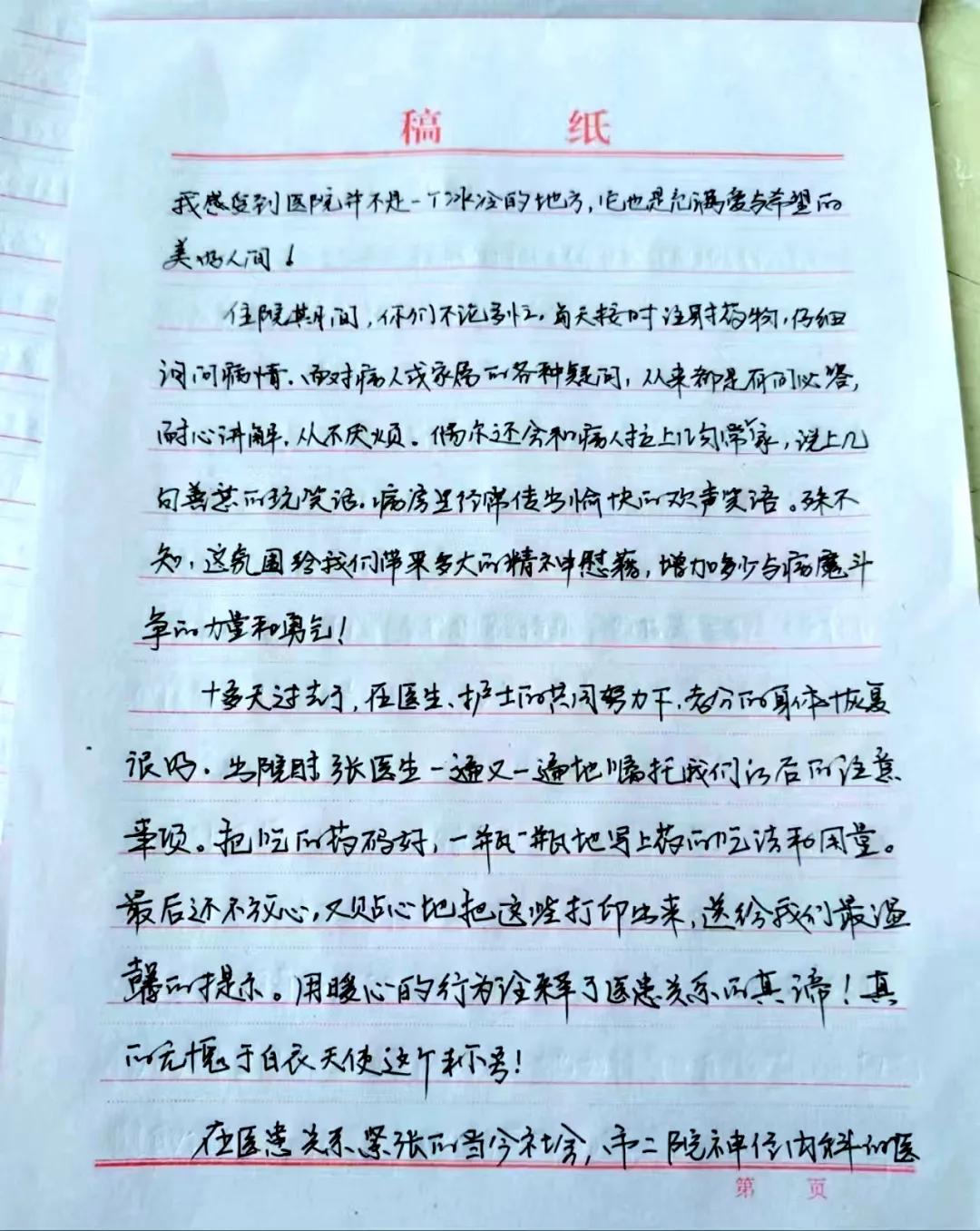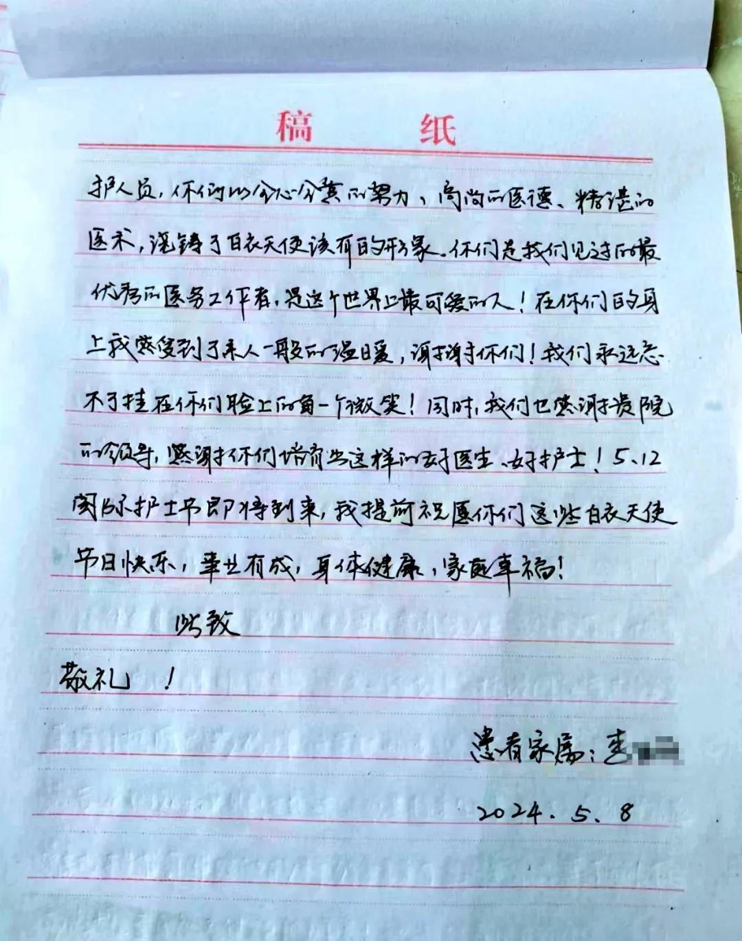每一封感謝信都飽含患者在醫(yī)院就診的滿意體驗(yàn),是對(duì)醫(yī)護(hù)人員專業(yè)診療、精心護(hù)理的認(rèn)可。它們傳遞的不僅是感謝之情,更見證了醫(yī)護(hù)人員關(guān)愛患者、服務(wù)患者、無(wú)私奉獻(xiàn)的崇高精神和道德情操。同時(shí),也激勵(lì)市二院全體醫(yī)務(wù)工作者繼續(xù)踏踏實(shí)實(shí)地做好本職工作,用真心和愛心為患者解除痛苦、用責(zé)任和技術(shù)守護(hù)百姓健康。(尹紅婭 徐曉爽)
