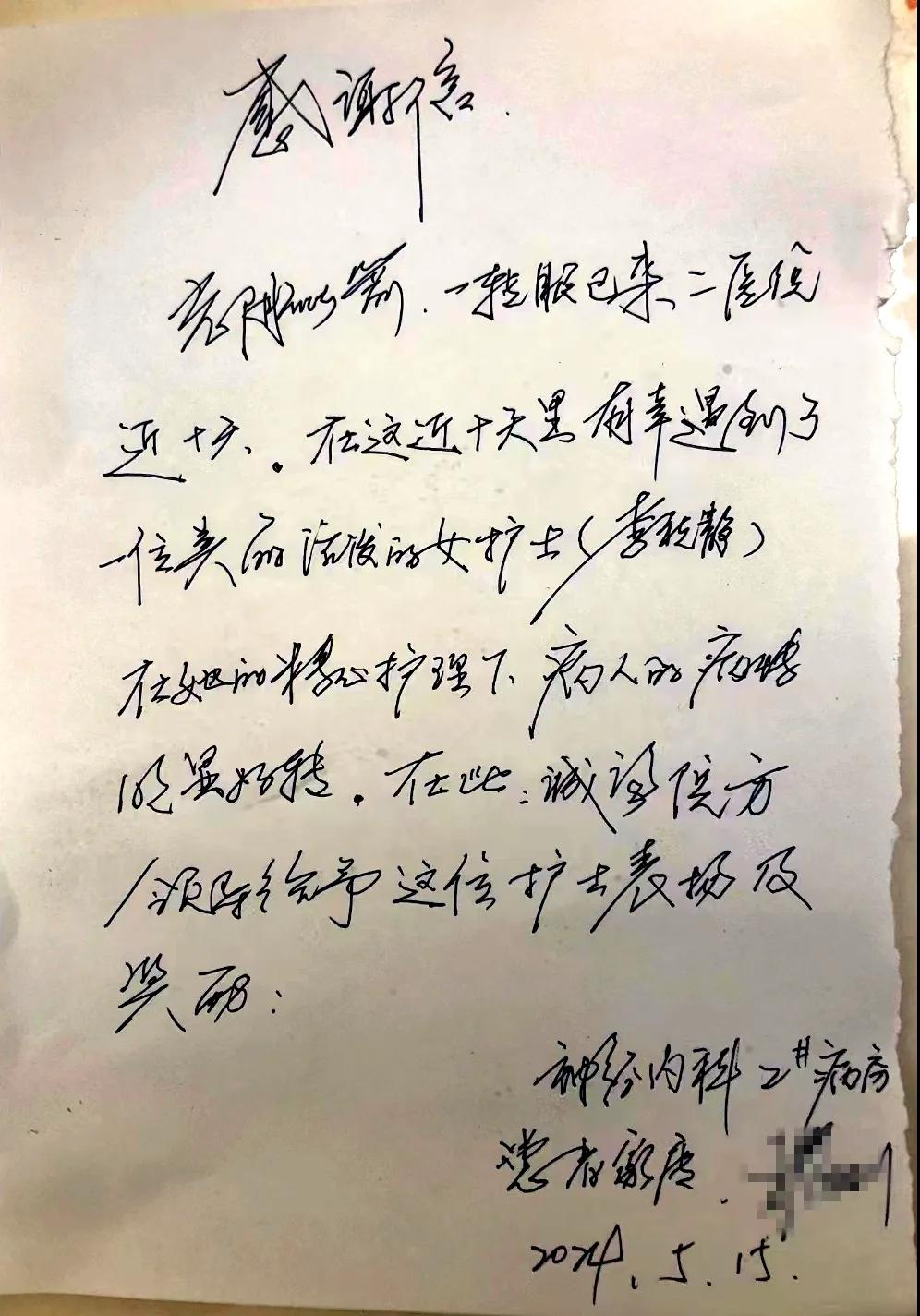患者張女士長(zhǎng)期受困于癱瘓狀態(tài),無(wú)法正常行走與進(jìn)食,且伴有四肢肌張力異常增高的癥狀。在呂杰民主任與曹軍軍醫(yī)生共同制定的精確治療方案下,以及護(hù)理團(tuán)隊(duì)持續(xù)、細(xì)致地照料,患者病情得到顯著改善。為感謝護(hù)士李秋靜在住院期間對(duì)患者提供的無(wú)微不至的關(guān)懷,5月15日,在即將出院之際,患者家屬將一封感謝信送到科室,以表達(dá)由衷的感激之情。