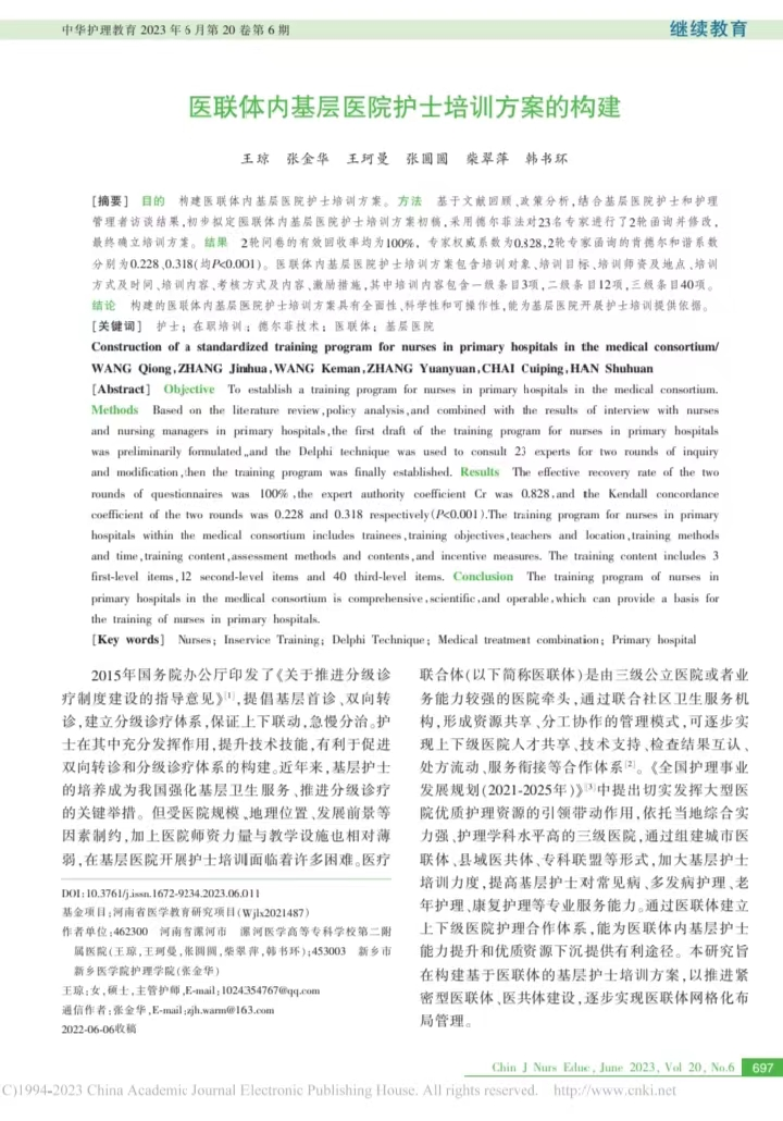 漯河醫(yī)專二附院(漯河市骨科醫(yī)院、漯河市立醫(yī)院)作為國家三級(jí)綜合醫(yī)院,高度重視醫(yī)聯(lián)體建設(shè),自2019年成立醫(yī)聯(lián)體組織以來,作為牽頭單位已簽署了30余家成員單位,近年來不斷探索基層醫(yī)院護(hù)士來院培訓(xùn)學(xué)習(xí)方案,2021年我院申報(bào)獲批河南省醫(yī)學(xué)教育研究項(xiàng)目1項(xiàng),項(xiàng)目名稱為“區(qū)域醫(yī)療聯(lián)合體內(nèi)基層醫(yī)院護(hù)士規(guī)范化培訓(xùn)管理模式的構(gòu)建”,項(xiàng)目團(tuán)隊(duì)成員經(jīng)過文獻(xiàn)檢索、調(diào)查研究、專家函詢等形式構(gòu)建了“基于醫(yī)聯(lián)體的基層醫(yī)院護(hù)士培訓(xùn)方案”,該培訓(xùn)方案具有可信性、可行性和可操作性,內(nèi)容全面,有助于提高基層護(hù)士專業(yè)服務(wù)能力的提升,被中文核心期刊中華護(hù)理教育雜志錄用并發(fā)表。