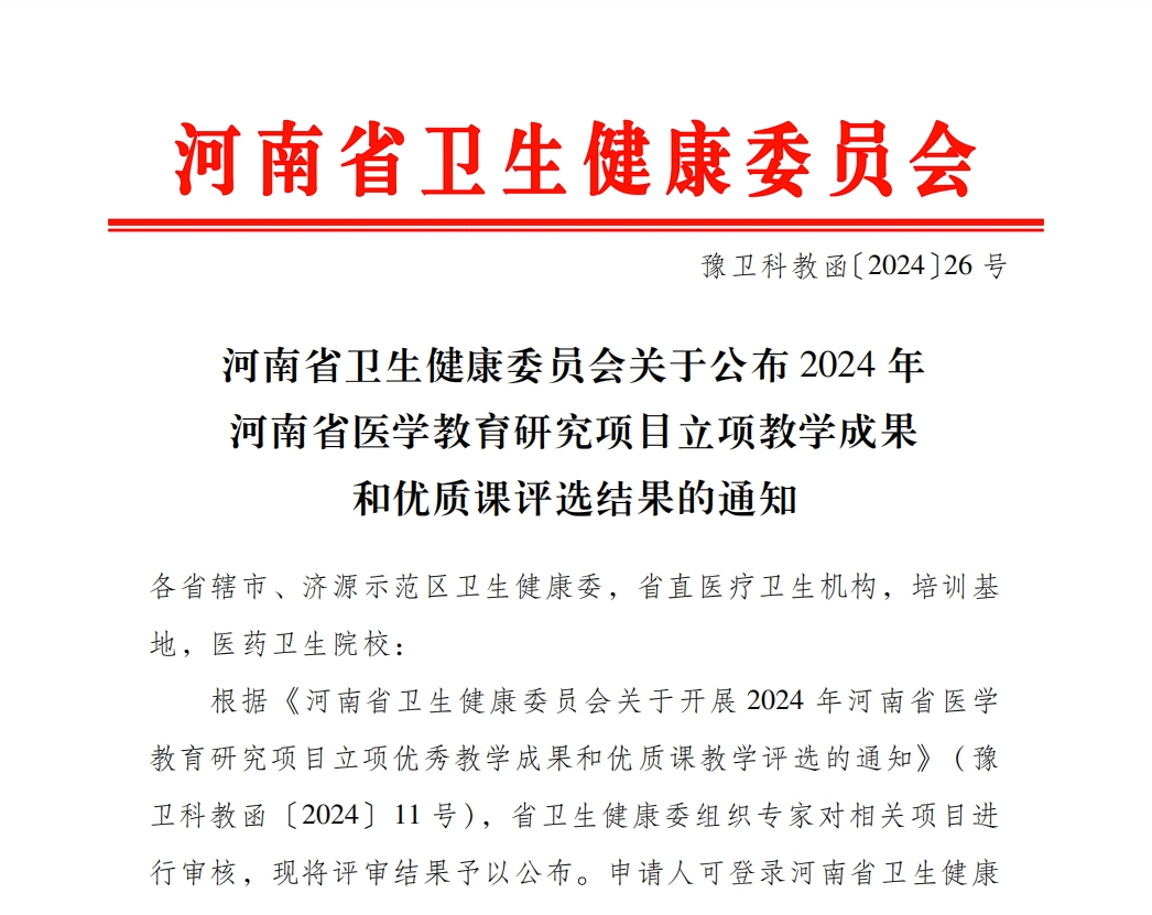 近日,河南省衛(wèi)生健康委員會(huì)下發(fā)了《關(guān)于公布2024年河南省醫(yī)學(xué)教育研究項(xiàng)目立項(xiàng)教學(xué)成果和優(yōu)質(zhì)課評(píng)選結(jié)果的通知》,由漯河市骨科醫(yī)院(漯河醫(yī)專二附院、漯河市立醫(yī)院)王瓊、趙春紅、楊冬松、曹慧芳、陳敏、韓書環(huán)、柴翠萍團(tuán)隊(duì)完成的《區(qū)域醫(yī)療聯(lián)合體內(nèi)基層醫(yī)院護(hù)士規(guī)范化培訓(xùn)管理模式構(gòu)建》項(xiàng)目完成結(jié)項(xiàng),被授予2024年河南省醫(yī)學(xué)教育優(yōu)秀教學(xué)成果一等獎(jiǎng)。