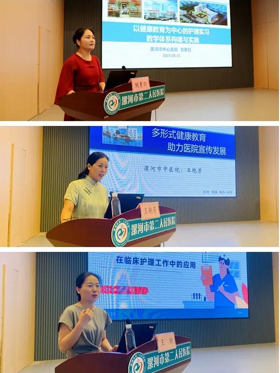 學術交流會上,來自全市各級醫(yī)療機構的護理健康教育專家們齊聚一堂,結合自身的實踐經(jīng)驗和研究成果,共同探討護理健康教育的新理念、新方法、新技術。市中心醫(yī)院護理部副主任劉素紅講解了《以健康教育為中心的護理實習教學體系構建與實施》,分享醫(yī)院在護理實習教學中以健康教育為中心開展帶教的亮點、實踐經(jīng)驗和對未來的展望;市中醫(yī)院呼吸消化科護士長王艷芳講解了《多形式健康教育助力醫(yī)院宣傳發(fā)展》,分享醫(yī)院開展健康教育項目的具體實施和取得的成效;市醫(yī)專二附院中醫(yī)骨傷科護士長王瓊講解了《健康宣教在臨床護理工作中的應用》,通過了解健康教育的方式方法談到如何把健康教育落到實處;市六院護理部副主任崔臻講解了《創(chuàng)新理念與健康教育》,通過對傳統(tǒng)健康教育模式的反思談到創(chuàng)新理念在健康教育中的應用;市二院護理部主任高凱霞講解了《家庭病床醫(yī)護團隊如何進行健康教育實踐活動》,通過案例展示如何開展健康教育;市二院普外科護士長王書霞、神經(jīng)內科護士長徐曉爽分別講解了《腫瘤患者吃-動-心平衡健康管理》《護理健康教育的發(fā)展與臨床實踐》,運用實例、典故等強調健康教育的必要性和重要性,展示了臨床工作中取得的成果。
