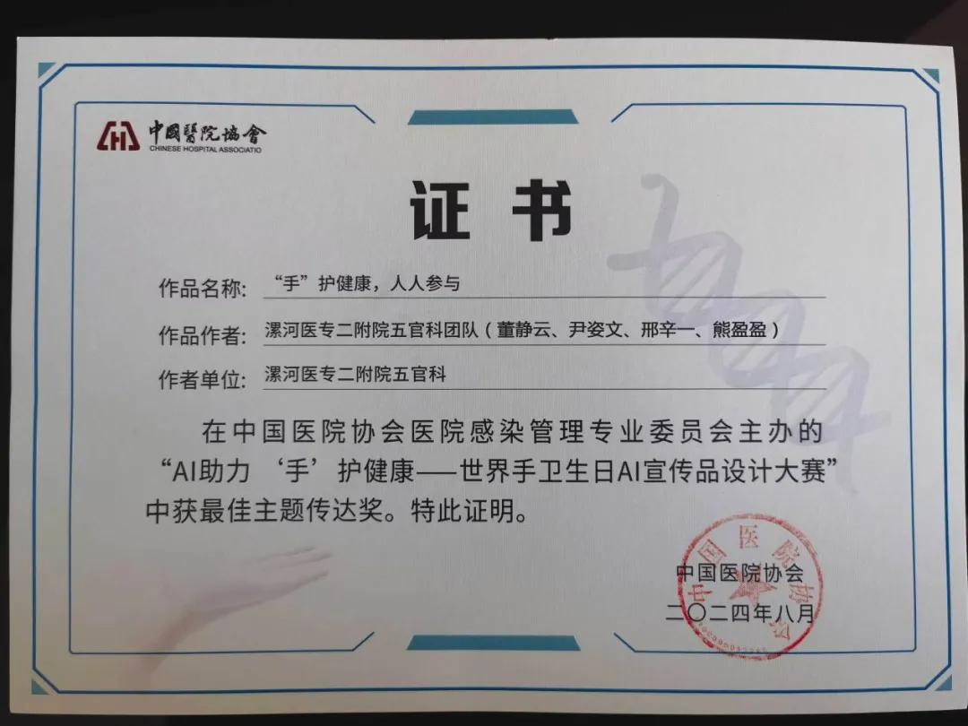 中國(guó)醫(yī)院協(xié)會(huì)醫(yī)院感染管理專(zhuān)業(yè)委員會(huì)特別舉辦了世界手衛(wèi)生日AI宣傳品設(shè)計(jì)大賽,旨在通過(guò)數(shù)字技術(shù)和人工智能為醫(yī)院感染防控培訓(xùn)與宣傳注入新的活力?;顒?dòng)共收到來(lái)自全國(guó)29個(gè)省/自治區(qū)/直轄市100座城市186家單位的384幅參賽作品,入圍40幅作品中河南省內(nèi)醫(yī)院有4所。我院五官科團(tuán)隊(duì)?wèi){借作品“手”護(hù)健康,人人參與,在眾多參賽作品中脫穎而出,9月1日在中國(guó)醫(yī)院協(xié)會(huì)第30屆全國(guó)醫(yī)院感染管理學(xué)術(shù)年會(huì)閉幕式、頒獎(jiǎng)儀式暨青年沙龍啟動(dòng)儀式上公布獲獎(jiǎng)名單,我院參賽作品獲得最佳主題傳達(dá)獎(jiǎng)中的最高分。由大會(huì)主席、中國(guó)醫(yī)院協(xié)會(huì)醫(yī)院感染管理專(zhuān)業(yè)委員會(huì)主任委員、北京大學(xué)第一醫(yī)院副院長(zhǎng)李航及中國(guó)醫(yī)院協(xié)會(huì)醫(yī)院感染管理專(zhuān)業(yè)委員會(huì)副主任委員、國(guó)家醫(yī)院感染管理質(zhì)量控制中心專(zhuān)家、浙江大學(xué)醫(yī)學(xué)院附屬第二醫(yī)院感染管理科主任陸群為獲得最佳主題獎(jiǎng)的代表頒獎(jiǎng)。這一榮譽(yù)不僅是對(duì)創(chuàng)作團(tuán)隊(duì)創(chuàng)意與努力的肯定,更是對(duì)醫(yī)院整體實(shí)力、團(tuán)結(jié)協(xié)作精神的認(rèn)可。