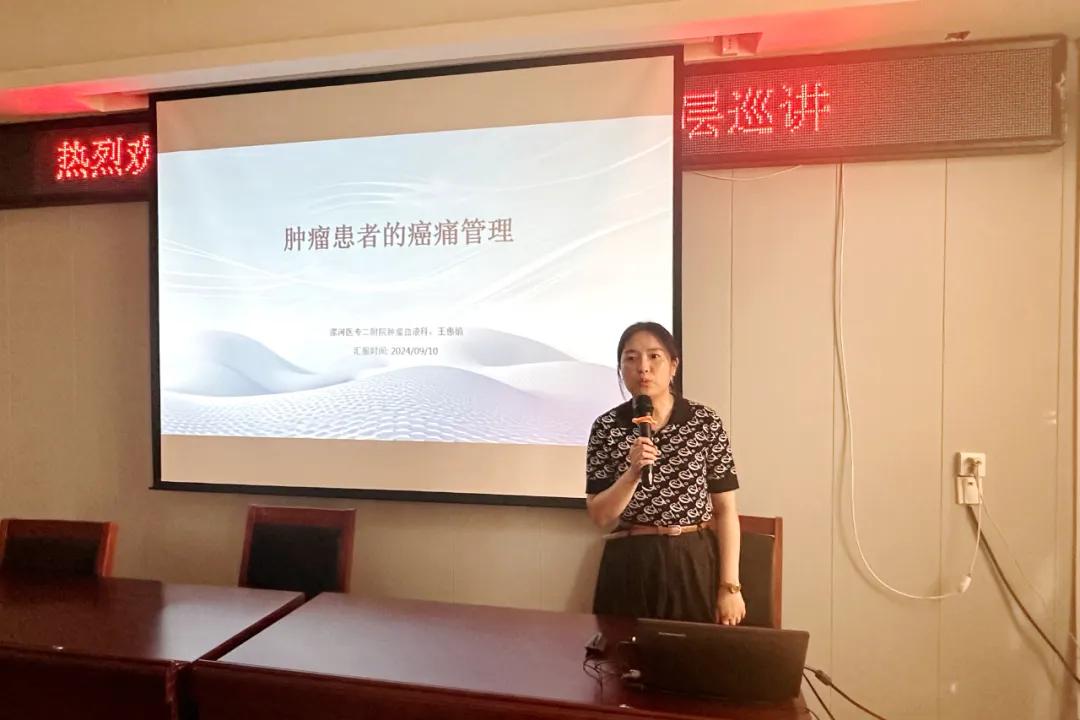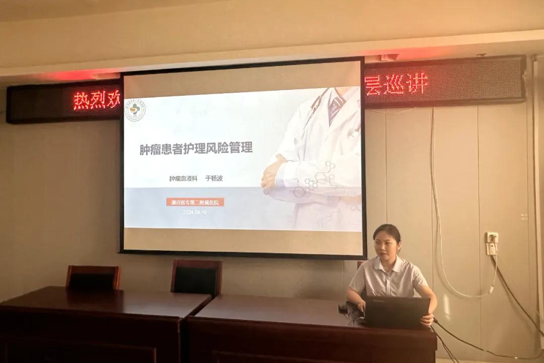 此次巡講中,于楊波護(hù)士長、張姣主管護(hù)師、王惠娟主管護(hù)師分別就《腫瘤患者護(hù)理風(fēng)險(xiǎn)管理》《靜脈治療血管通路管理規(guī)范》《腫瘤患者癌痛規(guī)范化管理》為主題進(jìn)行了精彩分享。其中于楊波護(hù)士長主要是從腫瘤患者常見的護(hù)理風(fēng)險(xiǎn)問題如何識別、評估、規(guī)范管理以及護(hù)理風(fēng)險(xiǎn)管理的一些措施、經(jīng)驗(yàn)、理念進(jìn)行了分享。