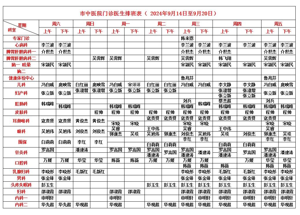 漯河市中醫(yī)院門診醫(yī)生排班表