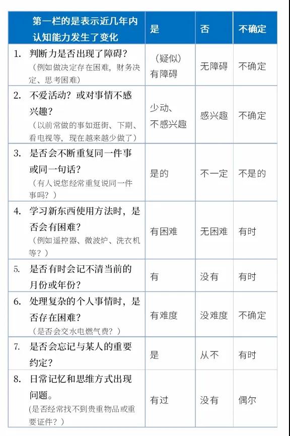 目前比較常用的是AD8癡呆篩查量表,它通過8個簡單的問題,快速評估是否有阿爾茨海默病風險。如果出現(xiàn)2個及以上的表現(xiàn),則要及時到醫(yī)院就診咨詢,進一步明確診斷。 (殷旭芳)