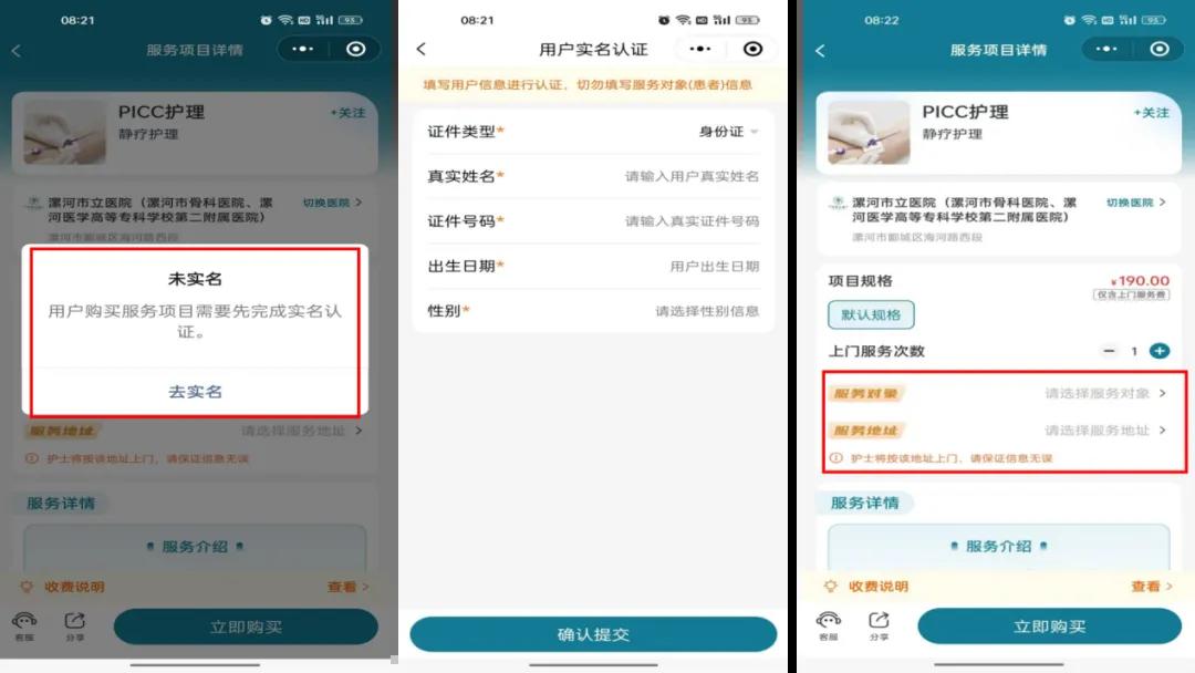 3.購買之后需實名認證,請正確填寫各項信息,服務(wù)對象填寫的是需要被護理的患者,地址填寫準確。