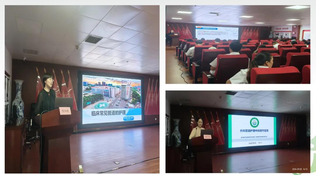 漯河市骨科醫(yī)院管道護理學組組長侯紅艷護士長通過PPT培訓的方式對各類管道的固定方法、固定流程,標識使用進行了詳細的講解,護士們加深了對管道規(guī)范固定重要性的認識,對規(guī)范臨床管道護理工作起到了良好的指導作用。婦產(chǎn)科護士長譚少允針對《外科管道護理中的細節(jié)管理》做了詳盡的說明。康復醫(yī)學科護士長田智慧分享了《血管導管相關(guān)感染預防與控制指南解讀》,預防血管內(nèi)導管相關(guān)血流感染的原因進行分析,并采取相關(guān)舉措后在臨床中獲取的成效和學員們分享經(jīng)驗。