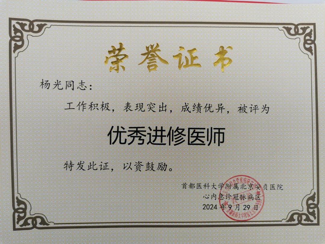 近日,市二院心血管內(nèi)科主治醫(yī)師楊光在首都醫(yī)科大學(xué)附屬北京安貞醫(yī)院完成為期一年的進(jìn)修學(xué)習(xí),現(xiàn)順利結(jié)業(yè)、學(xué)成歸來,因在進(jìn)修期間表現(xiàn)優(yōu)異,被評(píng)為北京安貞醫(yī)院“優(yōu)秀進(jìn)修醫(yī)師”榮譽(yù)稱號(hào),不僅為醫(yī)院全體青年醫(yī)師樹立了榜樣,同時(shí)也給醫(yī)院心內(nèi)科專業(yè)發(fā)展注入新的活力,將所學(xué)轉(zhuǎn)化為生產(chǎn)力,把新知識(shí)、新技術(shù)傳播開來,讓更多患者受益。