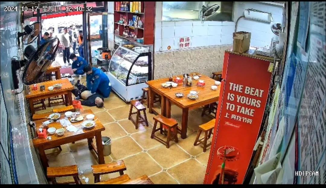 10 月 17 日中午 12 時 30 分,市二院急診科警報鈴聲響起,馬路街有一位中年男性就餐時突然暈倒、昏迷不醒、生命垂危,急需緊急救治。接到出車命令后,120指揮中心及急診科醫(yī)生王磊與現(xiàn)場人員保持持續(xù)通話,遠程指導,為患者進行心肺復蘇。與此同時,急救人員迅速行動,僅僅 3 分鐘就趕到了現(xiàn)場,快速評估后發(fā)現(xiàn)患者頸動脈搏動消失,無自主呼吸。