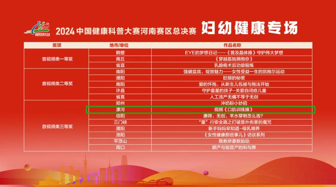 在大賽中,市二院憑借卓越表現(xiàn),原創(chuàng)作品《雙腿的控訴》獲得慢性病類作品三等獎、《背包俠客》獲得婦幼健康類作品三等獎、視頻作品《口肌訓(xùn)練操》獲得三等獎,為健康知識普及書寫了精彩篇章。