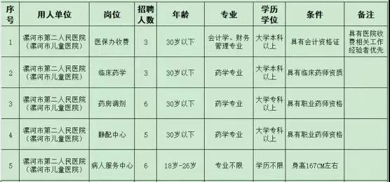 漯河市第二人民醫(yī)院(漯河市兒童醫(yī)院)因工作需要,需委托第三方以勞務(wù)派遣形式公開(kāi)招聘醫(yī)保辦收費(fèi)、臨床藥學(xué)、藥房調(diào)劑、靜配中心、病人服務(wù)中心等崗位人員共計(jì)23名,具體如下: