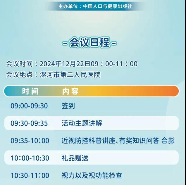 12月22日上午9:00(本周日),追光行動-兒童青少年近視防控科普講座將在漯河市第二人民醫(yī)院眼科門診舉辦,屆時將有眼科專家為青少年兒童及家長奉上一場精彩的科普講座,進(jìn)行免費現(xiàn)場咨詢指導(dǎo)。誠摯邀請感興趣的兒童及家長朋友們前來參與活動。