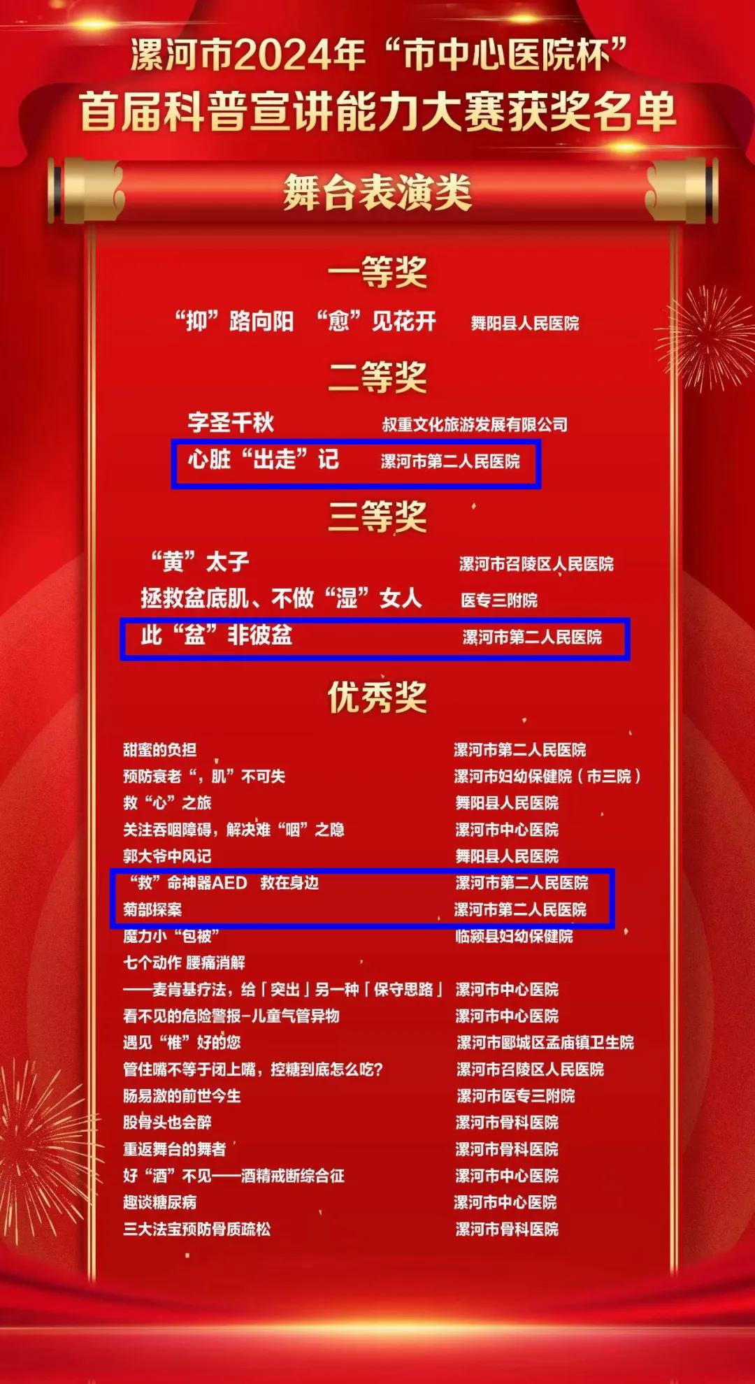 12月18日,由中共漯河市委宣傳部、中共漯河市委人才工作領(lǐng)導(dǎo)小組辦公室、漯河市科學(xué)技術(shù)協(xié)會、漯河市衛(wèi)生健康委員會聯(lián)合主辦,漯河市中心醫(yī)院冠名,漯河日報社承辦的漯河市2024年“市中心醫(yī)院杯”首屆科普宣講能力大賽決賽落下帷幕。經(jīng)過激烈角逐,市二院精心選送的參賽作品由劉橋、李媛、安自譚、袁泉、任崢崢出演的《心臟“出走”記》榮獲舞臺表演類二等獎;由井紅鴿、李靜麗、鄭家珍、丁歡歡、程亞麗出演的《此“盆”非彼“盆”》榮獲舞臺表演類三等獎;另有四個參賽作品榮獲優(yōu)秀獎。