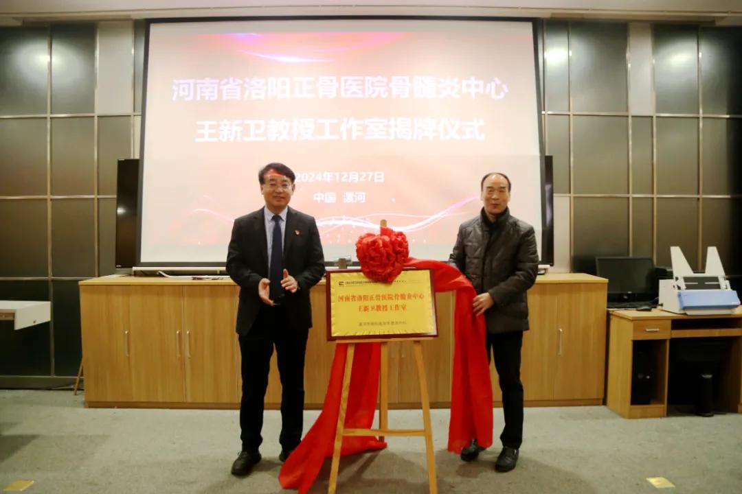 洛陽正骨醫(yī)院骨與關(guān)節(jié)感染診療中心主任王新衛(wèi)教授、漯河市骨科醫(yī)院黨委書記柴運洪共同為河南省洛陽正骨醫(yī)院王新衛(wèi)教授工作室揭牌。