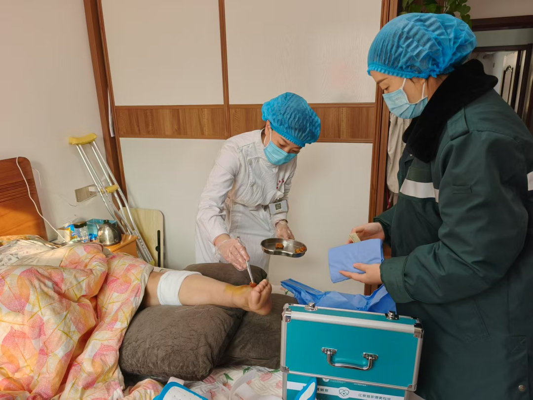 接到任務(wù)后,張燕燕護(hù)士長(zhǎng)帶領(lǐng)科室主管護(hù)師孟丹丹一起按照約定時(shí)間上門服務(wù),在對(duì)患者做了系統(tǒng)的傷口評(píng)估后,嚴(yán)格按照操作標(biāo)準(zhǔn),動(dòng)作輕柔又利落地對(duì)傷口進(jìn)行了創(chuàng)面消毒、換藥、包扎,同時(shí)耐心為患者及家屬講解了傷口居家護(hù)理的注意事項(xiàng)及患肢的功能鍛煉要點(diǎn)等。
