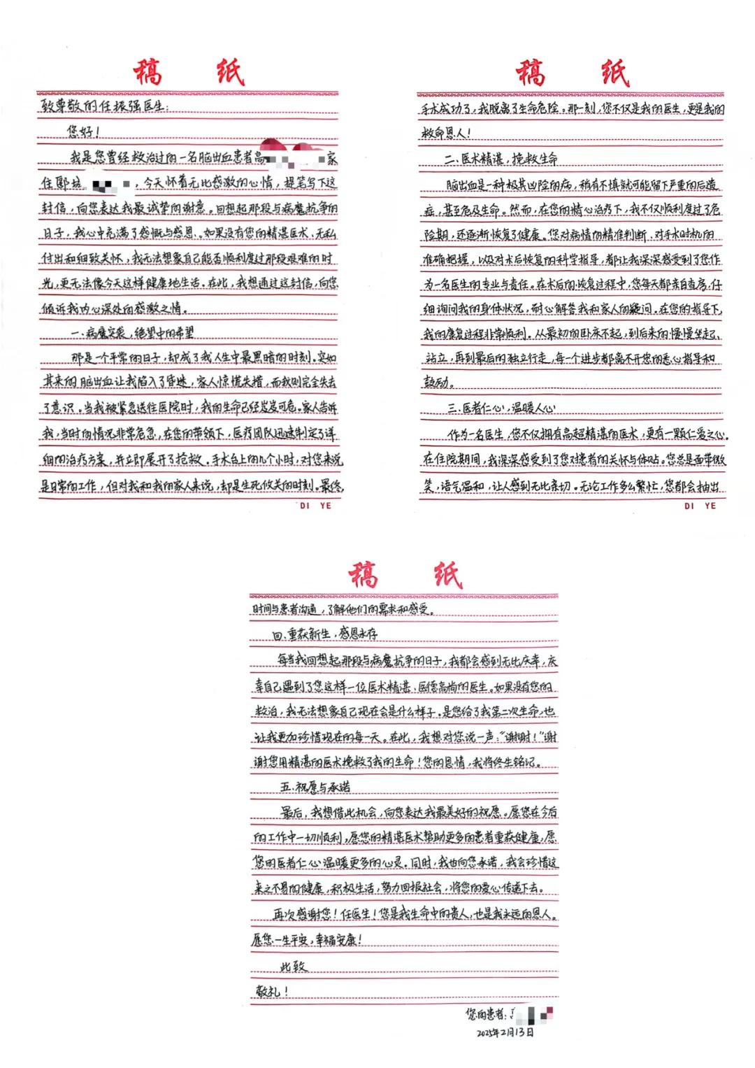 出院的患者回歸了正常的生活,回憶起在醫(yī)院的這段時(shí)間,他的心里充滿溫暖與感激,他將這份感激化作一封感謝信送給任振強(qiáng)醫(yī)生:"每當(dāng)我想起那段與病魔抗?fàn)幍娜兆?,我都?huì)感到無比慶幸,慶幸遇到您這樣一位醫(yī)術(shù)精湛、醫(yī)德高尚的醫(yī)生。如果沒有您的救治,我無法想象自己會(huì)是什么樣子,是您給了我第二次生命,也讓我更加珍惜現(xiàn)在的每一天。在此,我想對(duì)您說一聲:‘謝謝!’,謝謝您用精湛的醫(yī)術(shù)挽救了我的生命!您的恩情我將終生銘記……"(盧 闖 劉 旭 袁錦鈺)