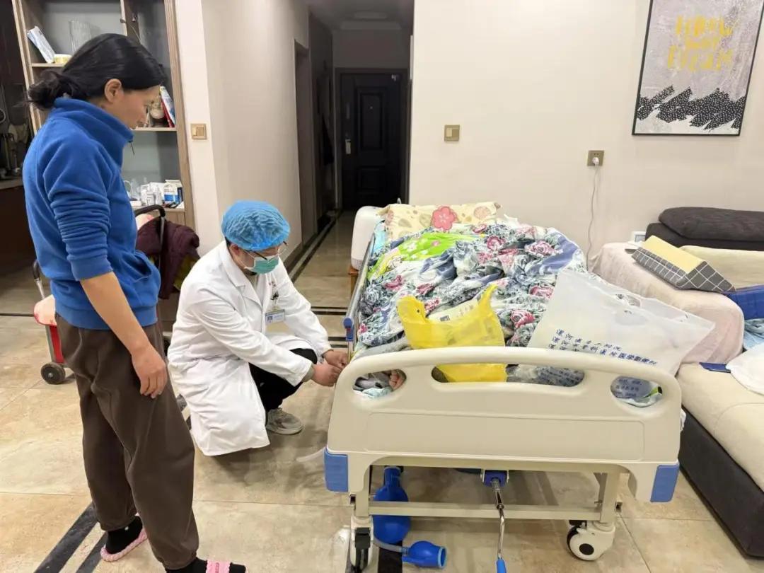 陳笑寒耐心地安撫家屬的情緒,同時(shí)迅速指導(dǎo)他們?cè)谠ソ∽o(hù)理到家平臺(tái)上進(jìn)行下單。訂單一經(jīng)接收,在閆衛(wèi)甫主任的全力支持下,她與醫(yī)生劉明啟迅速響應(yīng),僅用數(shù)分鐘便仔細(xì)核對(duì)并打包了所有必需品。盡管一天的勞累尚未消散,他們還是不顧疲憊,迎著暮色急忙趕往患者家中。