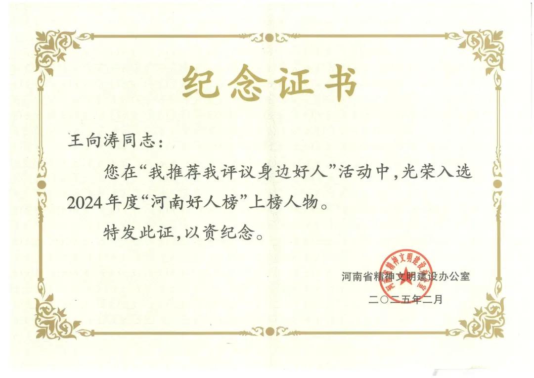 王向濤用十年如一日的堅守,踐行著志愿服務精神,用點滴善舉譜寫人間大愛。他多年來的奉獻與付出得到了社會各界的認可,先后獲得漯河市“為人民健康服務”紅旗標兵、“漯河青年五四獎章”、漯河市優(yōu)秀志愿者、漯河市過硬好黨員、漯河好人、漯河市十佳市民等榮譽。(功能檢查科:郭輝)