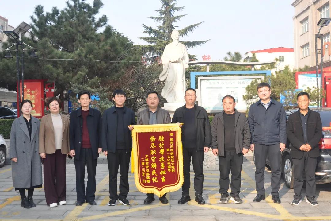 2月28日上午,源匯區(qū)大劉鎮(zhèn)黨委書(shū)記郭嘉琦帶領(lǐng)鎮(zhèn)干部同大陳村“兩委”干部一行來(lái)到漯河市中醫(yī)院,將“深情幫扶辦實(shí)事,鄉(xiāng)村振興譜新篇 ”和“駐村幫扶勇?lián)?dāng),恪盡職守解民憂”兩面錦旗分別送到漯河市中醫(yī)院黨委副書(shū)記、副院長(zhǎng)張文吉和醫(yī)院派駐大陳村“第一”書(shū)記朱振華的手中,以此感謝漯河市中醫(yī)院兩年多來(lái)對(duì)大劉鎮(zhèn)大陳村脫貧攻堅(jiān)以及鄉(xiāng)村振興工作的傾情幫扶和大力支持,院黨委副書(shū)記、副院長(zhǎng)張文吉帶領(lǐng)相關(guān)科室負(fù)責(zé)人接待并召開(kāi)座談會(huì)。