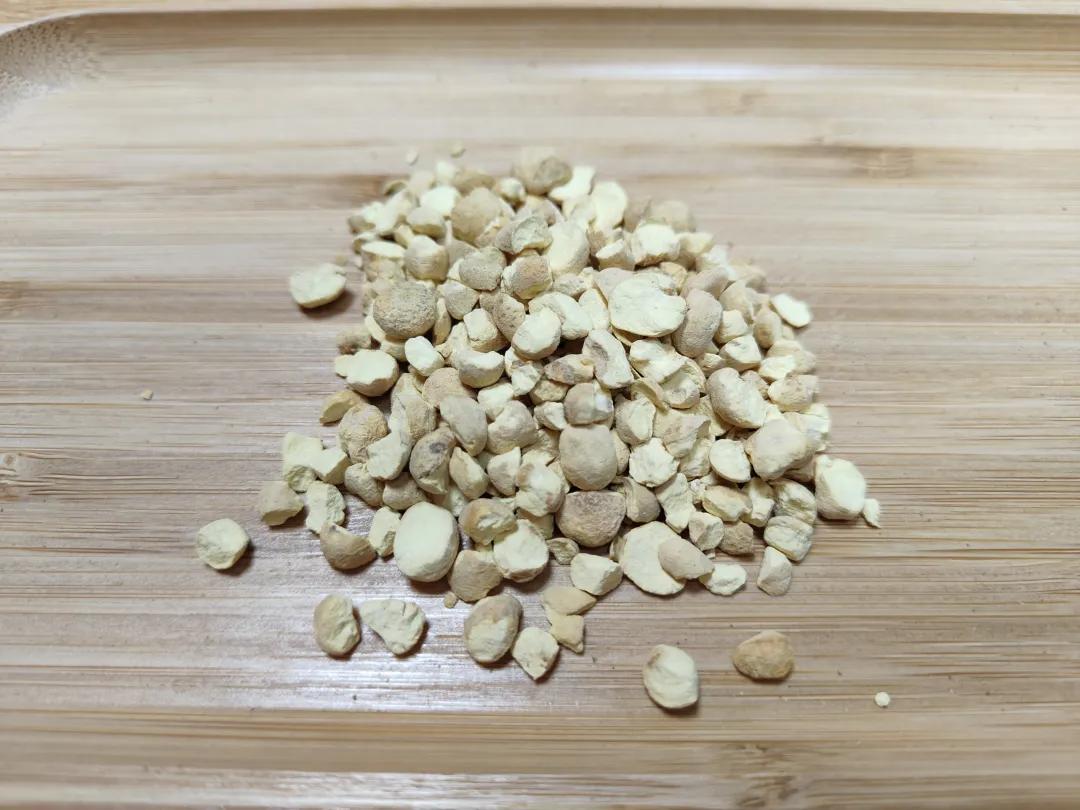 3、法半夏,去凈半夏加清水,浸泡至內(nèi)無(wú)干心取出,加甘草石灰液浸泡,(取甘草適量,加水煎煮兩次,合并煎液倒入。用適量石灰水配制的石灰液中),每日攪拌1~2次,并保持浸液PH12以上,至剖面黃色均勻,口嘗微有麻舌感為度,取出洗凈,陰干或空干。每100kg半夏用甘草15kg 生石灰10kg。
