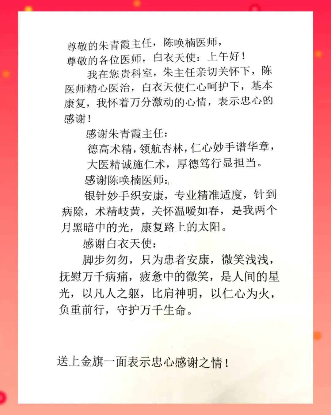 近日,市二院中醫(yī)針灸科門診醫(yī)護人員一如既往地忙碌著。突然,走廊里傳來一陣熱烈的掌聲,原來,74歲的田大叔在家人陪伴下,手捧錦旗和感謝信來到醫(yī)院。田大叔激動地展開感謝信,聲情并茂地朗讀起來,說到動情處更是眼含熱淚,字里行間飽含著對中醫(yī)針灸科主任朱青霞的誠摯謝意和對整個醫(yī)護團隊精湛醫(yī)術(shù)與暖心服務(wù)的認可與贊美。讀完,田大叔深深地鞠躬致謝,這一躬身,更是見證中醫(yī)針灸科‘破冰’三十年病痛,醫(yī)患同心最好的詮釋。