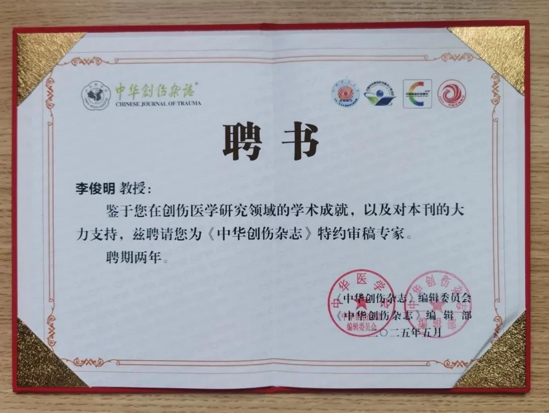 近日,漯河醫(yī)專二附院(漯河市骨科醫(yī)院、漯河市立醫(yī)院)手顯微外科(修復重建外科)主任兼大骨科副主任、骨科三級主任醫(yī)師、碩士研究生導師李俊明教授被《中華創(chuàng)傷雜志》特聘為特約審稿專家。此殊榮是對其在手顯微外科醫(yī)學研究領域?qū)W術能力的肯定,也彰顯了醫(yī)院在該領域的成就,為醫(yī)院發(fā)展提供了與國內(nèi)外頂尖專家交流的寶貴機會。