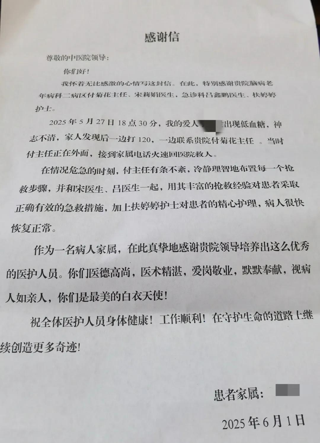 據(jù)了解,該女士其丈夫患腦血管疾病,曾在市中醫(yī)院腦二科就診,是腦二病區(qū)付菊花主任的病人,后多次到腦二科找付醫(yī)生復(fù)診。5月27日晚,患者病情危急,患者家屬趕忙聯(lián)系付菊花,付菊花當(dāng)時已下班回家,她接到電話后立即與院急診科和腦二科宋莉娟醫(yī)生聯(lián)系開展相關(guān)救治工作并抓緊到醫(yī)院參與救治,還用“醫(yī)生全年無休守護(hù)患者”的暖心話語安慰焦急的患者家屬。急診科的呂鑫鵬、扶婷婷也對患者采取正確有效的急救措施及精心護(hù)理,經(jīng)過各科室的精心救治,患者癥狀快速好轉(zhuǎn),病人家屬特送來信表示感謝。
