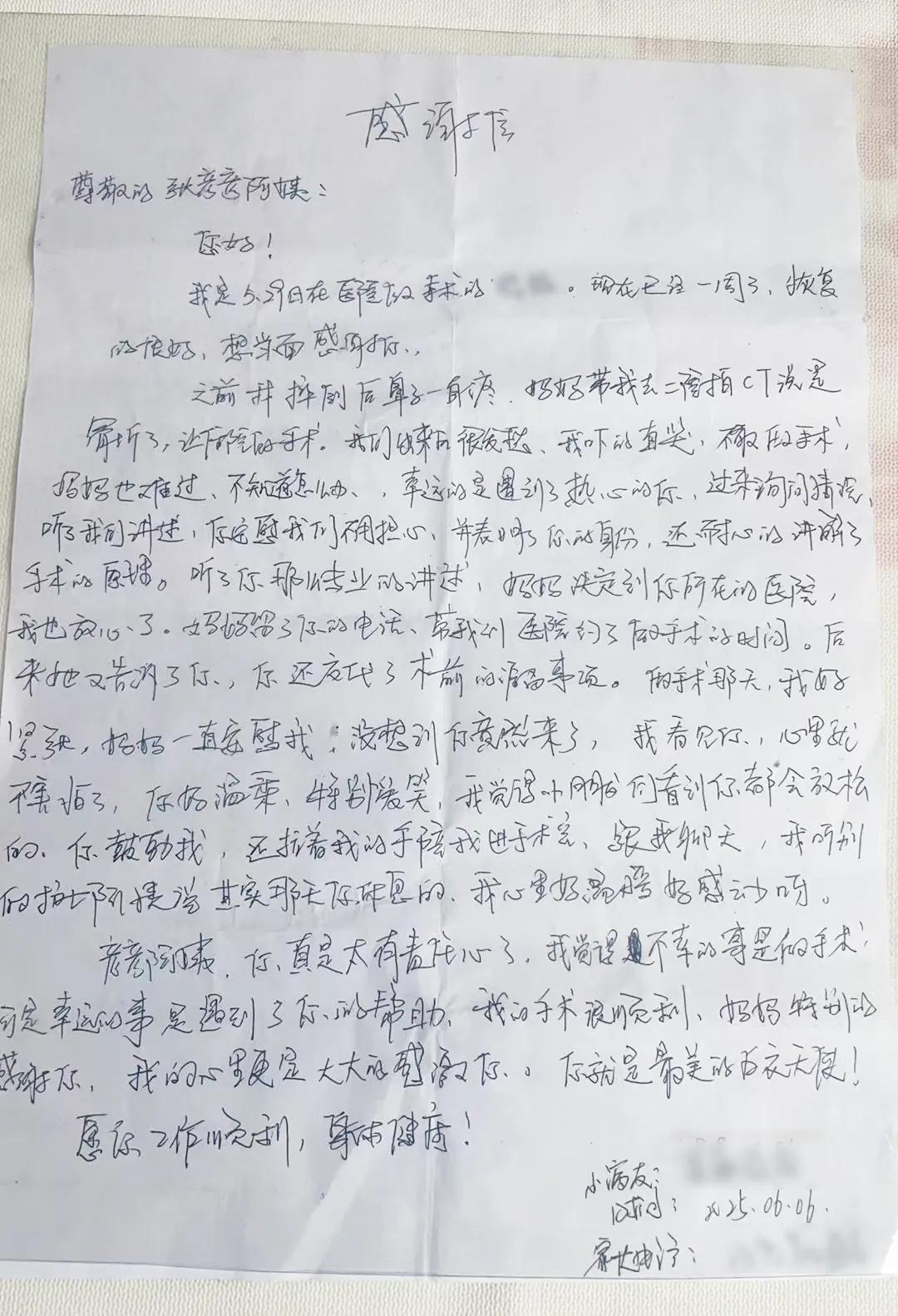 看似一個(gè)很平常的舉動(dòng),當(dāng)孩子?jì)寢尭嬷⒆右院螅∨笥言谛牡追N下了感恩的種子,出院以后專程來醫(yī)院送來了這封感謝信......