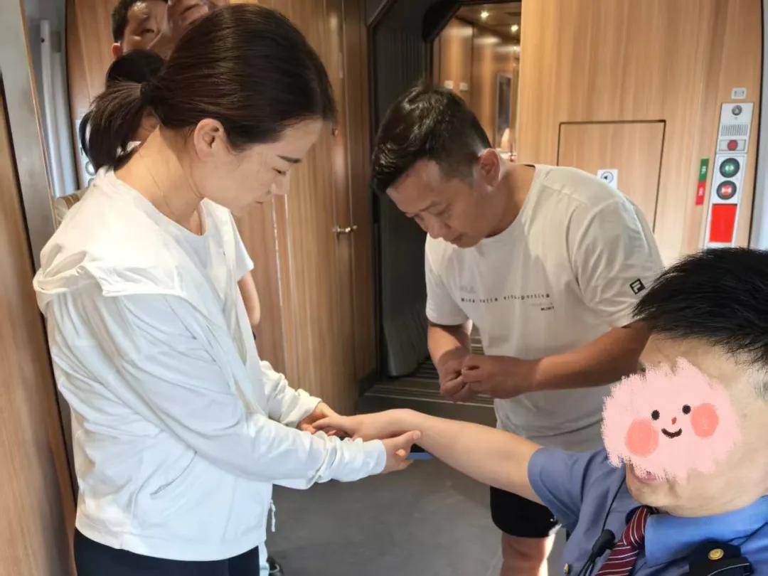 抵達現(xiàn)場,他們發(fā)現(xiàn)一名身著列車員制服的男性工作人員面色慘白、冷汗淋漓,因腰部劇痛蜷縮并呻吟。憑借豐富經(jīng)驗,兩人判斷其可能是腎結(jié)石引發(fā)的腎絞痛。在列車工作人員協(xié)助下,潘建濤施展中醫(yī)針灸,李璐同步監(jiān)測生命體征、安撫患者。經(jīng)救治,患者疼痛明顯減輕。他們向列車方交代后續(xù)注意事項后默默返回座位。