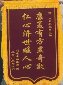 與此同時,科室還收到一面印有“康復有方顯奇效,仁心濟世暖人心”字樣的錦旗。在患病期間,患者飽受腰痛、下肢麻木等癥狀折磨,嚴重影響日常生活。來到康復科后,科室負責人張靜帶領科室團隊根據(jù)其病情制定個性化針灸治療方案,通過精準取穴、規(guī)范施針,配合專業(yè)康復指導,逐步減輕患者病痛,助其恢復正常生活?;颊邽楸砀屑?,特贈錦旗,錦旗上的話語是對科室治療效果的高度認可。