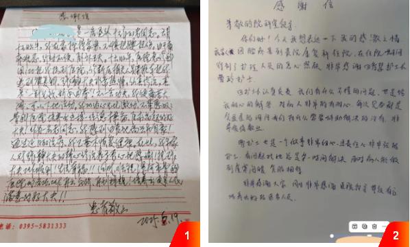另一封感謝信來自因腰疼住院的患者,信中感謝了護士長田智慧和護士曹玲。治療期間,兩位護理人員將專業(yè)、細致的服務貫穿始終。從日常康復護理操作到患者心理疏導,她們始終保持高度的責任心,耐心解答疑問、貼心安撫情緒,用暖心服務助力患者身心康復,贏得患者由衷的信賴與感激。