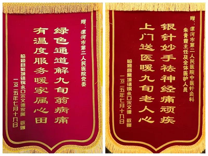 7月20日上午,市二院門診大廳暖意融融,92歲宋老先生的家屬手捧兩面錦旗,專程向醫(yī)院黨委和中醫(yī)針灸科表達(dá)最誠摯的謝意。副院長劉橋受院黨委委托與全國先進(jìn)工作者、全國“五一”勞動(dòng)獎(jiǎng)?wù)芦@得者、中醫(yī)針灸科主任朱青霞及科室團(tuán)隊(duì)熱情接待了家屬,并鄭重接過了這份沉甸甸的心意。