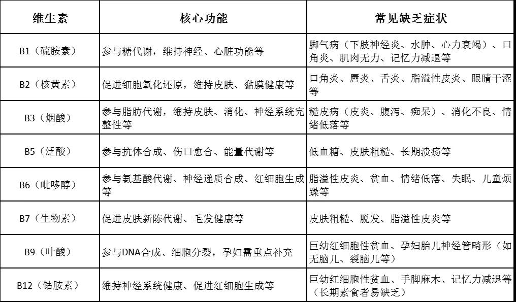 一、各類(lèi)B族維生素的核心功能與缺乏癥狀