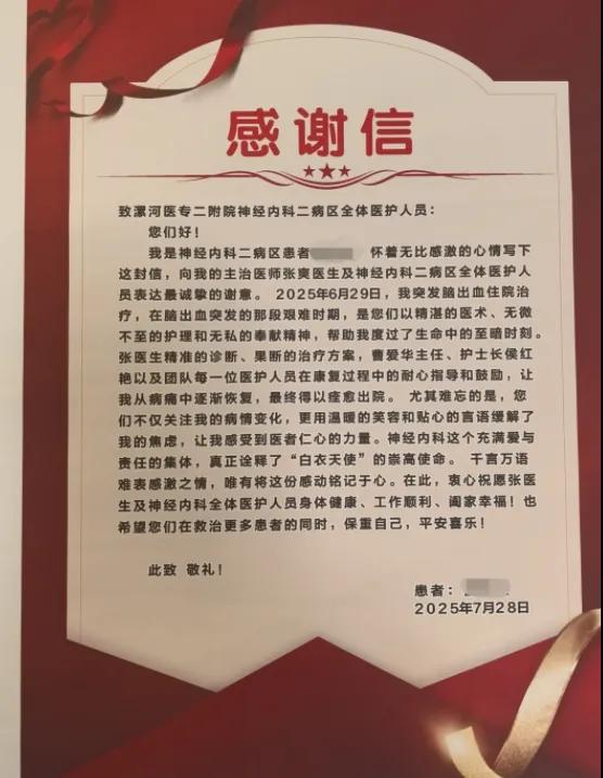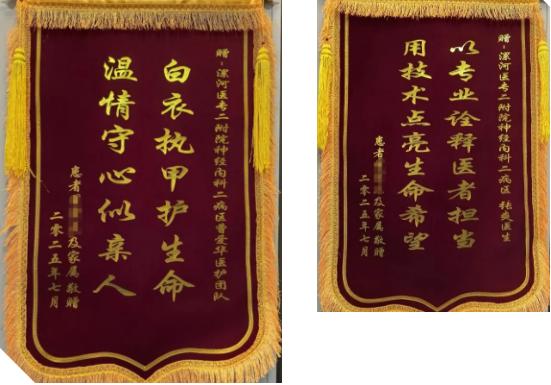 “你們不僅關(guān)注我的病情變化,更用溫暖的笑容和貼心的言語緩解了我的焦慮,讓我感受到醫(yī)者仁心的力量。”康復出院后,患者及家屬攜錦旗與感謝信再次來到醫(yī)院,他們把“以專業(yè)詮釋醫(yī)者擔當 用技術(shù)點亮生命希望”、“白衣執(zhí)甲護生命 溫情守心似親人”這樣的贊譽送給醫(yī)護人員,表達著對醫(yī)護團隊的認可,也彰顯了醫(yī)院多學科聯(lián)合會診機制,院前急救、院內(nèi)急診、院內(nèi)救治全流程閉環(huán)管理的顯著優(yōu)勢。