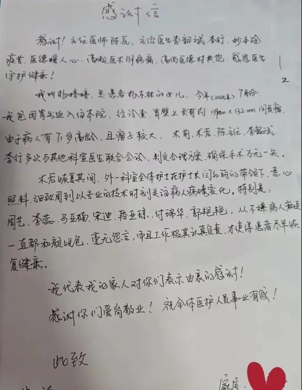 這封感謝信,是對(duì)普通外科全體醫(yī)護(hù)人員,尤其是對(duì)護(hù)理團(tuán)隊(duì)辛勤付出和專(zhuān)業(yè)精神的高度認(rèn)可與鼓勵(lì)。對(duì)團(tuán)隊(duì)而言,患者的康復(fù)和家屬的滿(mǎn)意是他們最大的追求。普通外科團(tuán)隊(duì)將繼續(xù)秉承“以患者為中心”的服務(wù)理念,不斷精進(jìn)醫(yī)療技術(shù),提升護(hù)理服務(wù)質(zhì)量,尤其是加強(qiáng)復(fù)雜、高齡患者圍手術(shù)期的精細(xì)化、人性化護(hù)理管理,用精湛的醫(yī)術(shù)祛除病痛,用溫暖的仁心守護(hù)健康,為更多患者帶來(lái)康復(fù)的希望和家的溫暖。(盧 闖 閆紅麗 劉 旭 袁錦鈺)