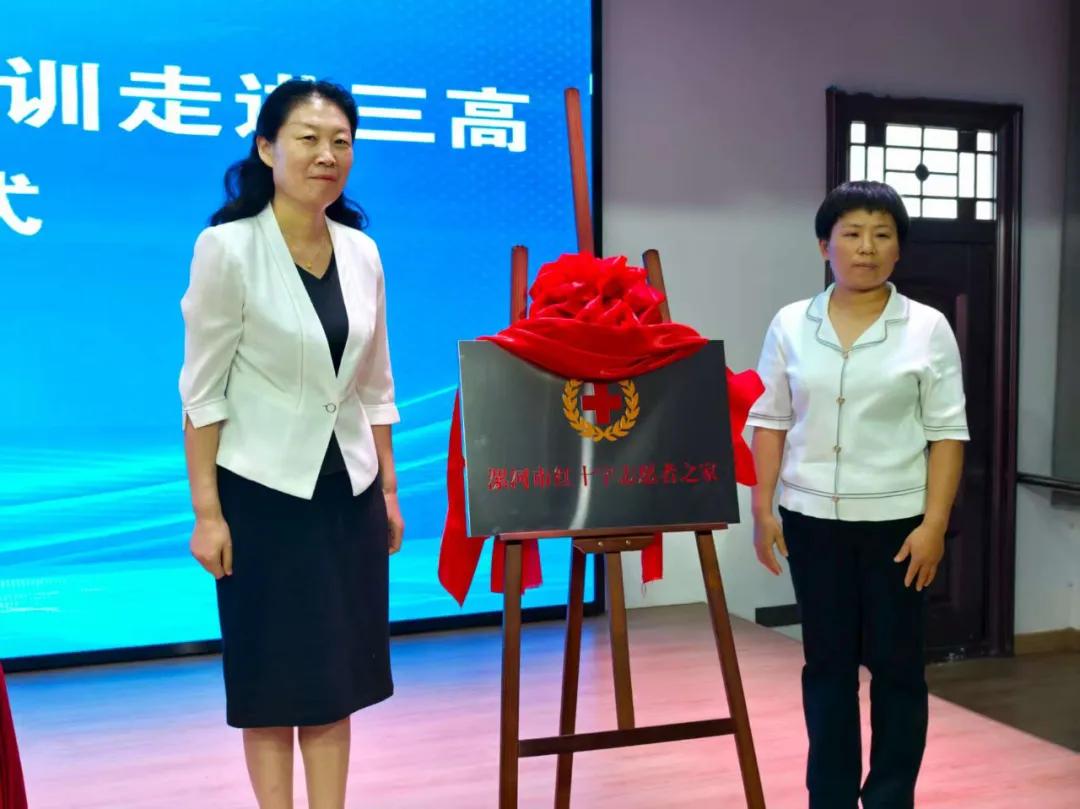 現(xiàn)場,郭俊偉向“漯河市第三高級中學(xué)紅十字應(yīng)急救護社團”代表授旗,孫潁華和胡海英共同為“紅十字志愿者之家”揭牌。