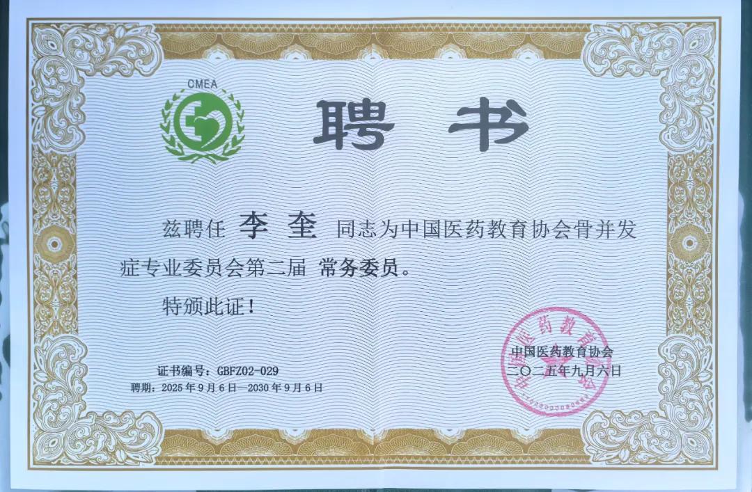 漯河醫(yī)專二附院名譽(yù)院長李奎教授獲聘中國醫(yī)藥教育協(xié)會骨并發(fā)癥專業(yè)委員會常務(wù)委員