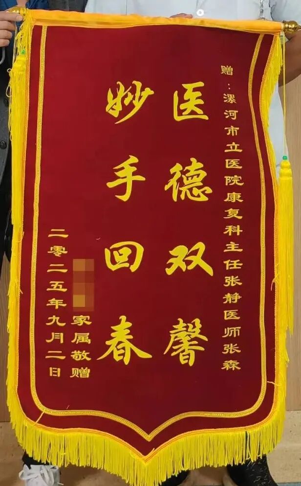 “醫(yī)德雙馨,妙手回春”——這面沉甸甸的錦旗,被患者鄭重地送到了漯河醫(yī)專二附院(漯河市骨科醫(yī)院、漯河市立醫(yī)院)康復(fù)醫(yī)學(xué)科張森醫(yī)生手中 ,這是患者對(duì)張醫(yī)生真摯的肯定,更是一段從絕望到重生的康復(fù)之路的見證。 一個(gè)半月前,患者因偏癱陷入困境:左側(cè)肢體完全活動(dòng)不利,神志不清、胡言譫語,溝通障礙,記憶功能受損,生活無法自理。康復(fù)醫(yī)學(xué)科團(tuán)隊(duì)立即制定個(gè)性化方案,中西醫(yī)結(jié)合開啟康復(fù)征程。