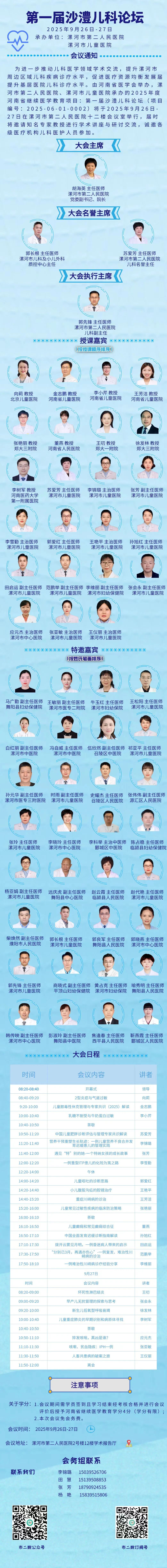 為進(jìn)一步推動兒科醫(yī)學(xué)領(lǐng)域?qū)W術(shù)交流,提升我市及周邊區(qū)域兒科疾病診療水平,促進(jìn)醫(yī)療資源均衡發(fā)展,提升基層醫(yī)院兒科診療水平。由河南省醫(yī)學(xué)會主辦,漯河市第二人民醫(yī)院、漯河市兒童醫(yī)院承辦的2025年度河南省繼續(xù)醫(yī)學(xué)教育項(xiàng)目:第1屆沙澧兒科論壇 (項(xiàng)目編號:2025-06-01-0002)學(xué)術(shù)會議將于2025年9月26-27日在漯河市第二人民醫(yī)院舉行,現(xiàn)將有關(guān)事項(xiàng)通知如下:
