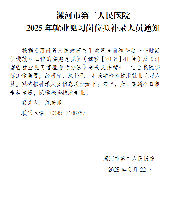 【公示】漯河市第二人民醫(yī)院2025年就業(yè)見(jiàn)習(xí)崗位擬補(bǔ)錄人員通知