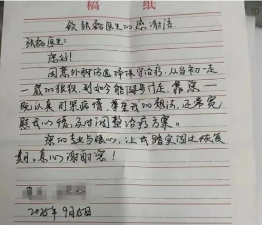 就這樣,在專業(yè)治療與耐心陪伴下,患者的腳踝一天天好轉:從最初只能緩慢行走,到后來能正常上下樓梯,再到如今可以輕松散步——曾經(jīng)讓患者困擾不已的“老大難”問題,終于徹底解決。出院那天,患者特意手寫了這封感謝信,字里行間滿是真誠:“張醫(yī)生不僅治好了我的疼痛,更撫平了我心里的焦慮,這樣的好醫(yī)生,值得我們真心感謝!”