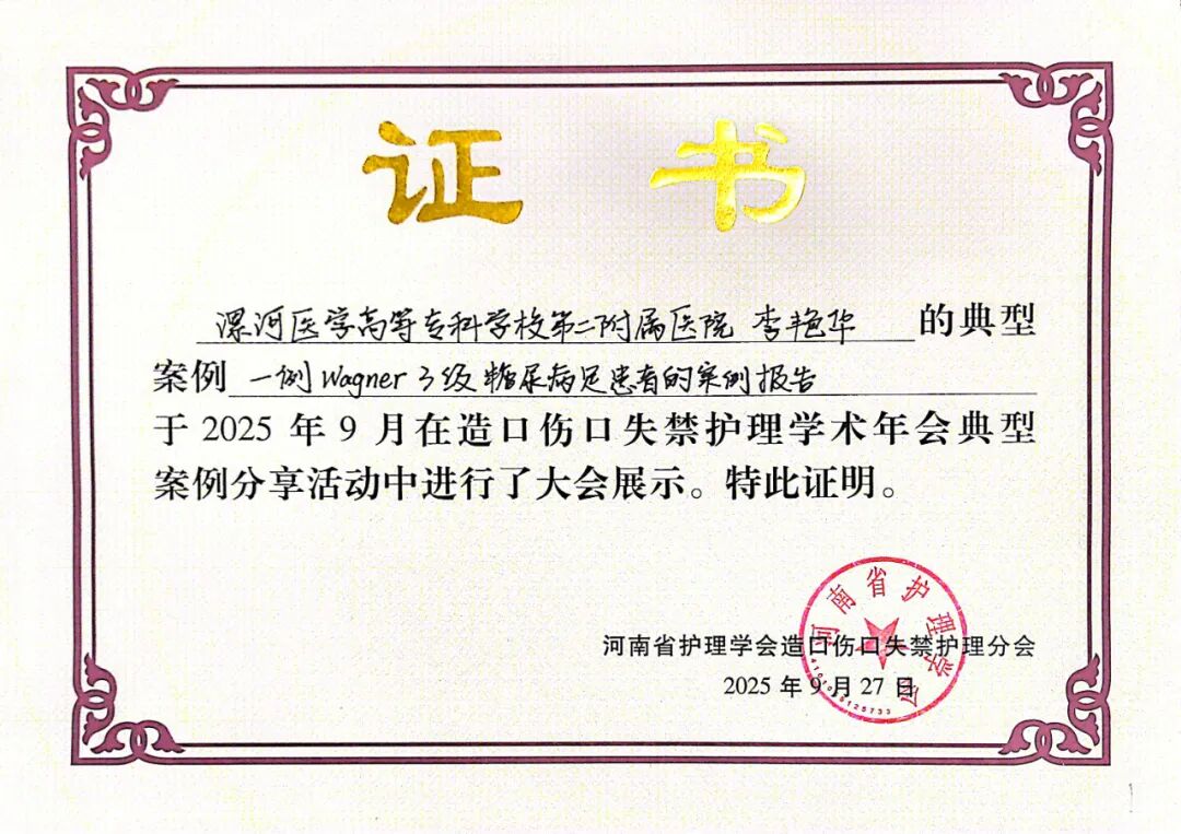 會上,漯河醫(yī)專二附院(漯河市骨科醫(yī)院、漯河市立醫(yī)院)壓力性損傷護理學(xué)組秘書、門診綜合治療室副主任護師李艷華的《一例 Wagner3級糖尿病足患者的案例報告》從全省200余例案例中脫穎而出,榮獲優(yōu)秀案例并進行現(xiàn)場展示。這是她第二次獲此殊榮,充分彰顯了醫(yī)院在??谱o理領(lǐng)域的深厚實力與學(xué)科建設(shè)的卓越成果。