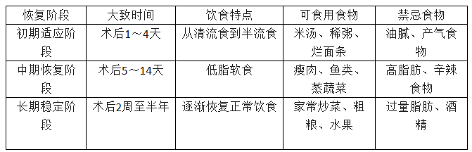 1.術(shù)后第1~2天,腸道功能尚未恢復(fù),此時(shí)通常需要禁食,待腸蠕動恢復(fù)、肛門排氣后,可開始進(jìn)食清流食。
