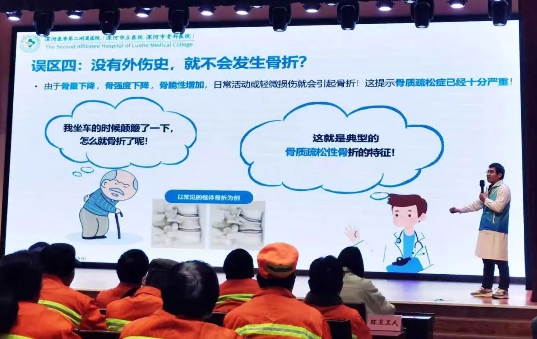 活動中,漯河醫(yī)專二附院骨科專家王松茂聚焦10月20日“世界骨質(zhì)疏松日”主題,針對基層群眾尤其是環(huán)衛(wèi)工人的工作特點,開展骨質(zhì)疏松專題健康科普講座。講座內(nèi)容貼合群眾需求,從骨質(zhì)疏松的成因、早期癥狀、預(yù)防方法到日常養(yǎng)護要點,進行了通俗細致的講解,幫助群眾建立科學(xué)的骨骼健康認(rèn)知,為預(yù)防骨質(zhì)疏松奠定基礎(chǔ)。