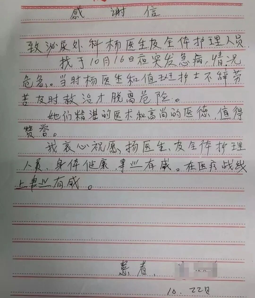 為感謝楊艷霞醫(yī)生的及時救治和護士們的貼心照顧,出院后患者特意寫下一封感謝信,字里行間滿是對楊醫(yī)生專業(yè)醫(yī)術、敬業(yè)精神和人文關懷的由衷贊譽,也表達了對醫(yī)院泌尿外科醫(yī)療服務的高度認可。