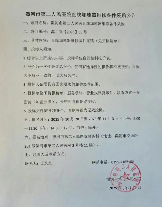 漯河市第二人民醫(yī)院直線加速器維修備件采購(gòu)公告